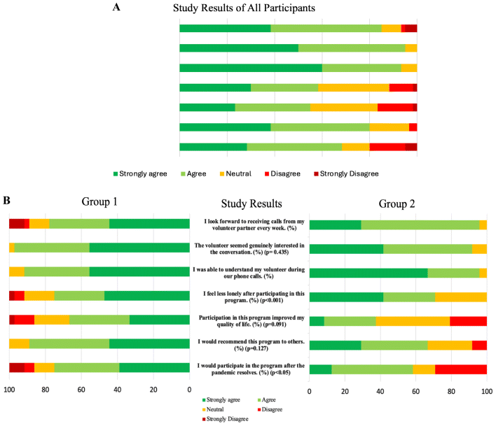 Referral source analyses showed that there were 36 participants in Group 1 and 24 participants in Group 2. Group 1 participants were more likely to be living alone (p<.001), were single (p<.001), reported subjective financial constraints (p<.05), and were less likely to help other family members/friends with daily tasks (p<.05). They were also more likely to want to participate in the program even outside the context of a pandemic (p<.05) and more likely to feel that their loneliness was reduced during program participation in comparison to Group 2 (p<.001). All study results are demonstrated in Figure 1.