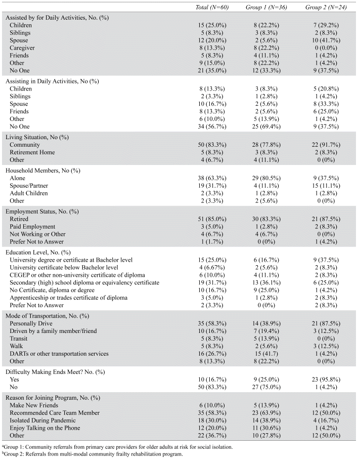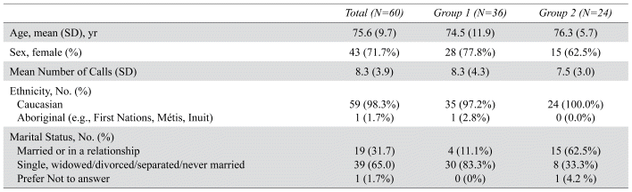 Our study had two distinct referral sources. Group 1 participants were referred by their primary care providers as being at risk for social isolation based on their clinical judgement. Group 2 participants were referred by a multi-modal community frailty rehabilitation program, where telephone befriending was one of the desired component interventions. Differences between these groups in terms of baseline characteristics and survey results were compared using the two-sided t-test and chi-squared test. Participants who completed fewer than four calls were not surveyed and were therefore excluded from outcome analyses. Missing or unreported data were not imputed.