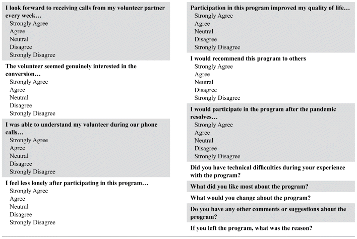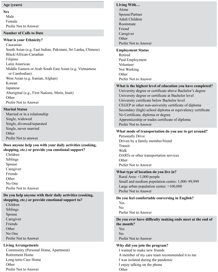 Research volunteers (not involved in making social calls) contacted participants to obtain their consent to acquire survey feedback about their experience in the program. Their participation did not affect their intervention enrolment. After a minimum of four weeks of program participation, a 27-question survey was administrated that identified participants’ sociodemographic and elicited their perceived satisfaction and experience with the program. This survey was pilot tested with a small number of participants. Inductive analysis was conducted to identify themes within the qualitative analysis following the recommendations of Thorne.(15) Descriptive statistics were used to summarize the demographic, program, and survey data. We report the survey results in accordance with the CROSS reporting guidelines for survey studies.(16)