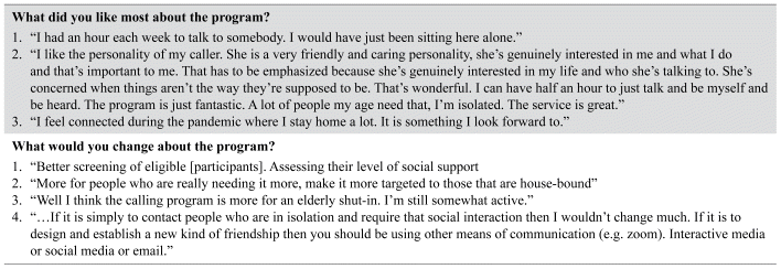 As shown in Figure 1, 58.3% (n=35) of the participants felt less lonely after program participation and 54.9% (n=33) stated the program improved their quality of life. Furthermore, 68.3% (n=41) indicated that they would continue to participate outside the context of a pandemic. A common theme was that participants enjoyed the routine companionship from student volunteers. Themes for improvement and reasons why participants may have left included: wanting to try different mediums of communication (e.g., videoconferencing) and adequate social support outside of the program.