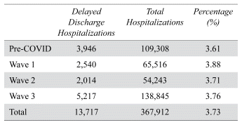 Our study demonstrated that prior to the COVID-19 pandemic, 3.61% of hospitalizations in older adults incurred delayed discharge days during their hospitalization and that this showed little change across the first three pandemic waves in Alberta, Canada. Overall, the demographic characteristics of patients who experienced delayed discharge did not differ before the pandemic or across the COVID-19 waves. Using health administrative data from the province of Ontario, Guilcher and colleagues similarly found little change in the rate of delayed discharge hospitalizations through Wave 1 and part of Wave 2 relative to pre-COVID.(19) The rationale behind the similarity in rate of delayed discharge was not clear to us. We were uncertain if the criteria for delayed discharge definition changed in response to pandemic measures and restrictions, which could potentially introduce bias towards null results.