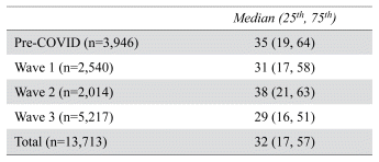 To examine the impact of the COVID-19 pandemic on the prevalence and the length of delayed discharge, a categorical variable that defined each pandemic wave was created. Currently, there is little scientific consensus on how to define pandemic waves. In the current study, the pandemic wave was defined per a Canada Communicable Disease Report published by the Government of Canada.(16) Wave 1 was defined as February 1, 2020 to August 31, 2020; Wave 2 was defined as September 1, 2020 to February 14, 2021; Wave 3 and beyond was defined as February 15, 2021 to March 31, 2022. We also created a pre-pandemic period from April 1, 2019 until January 31, 2020.