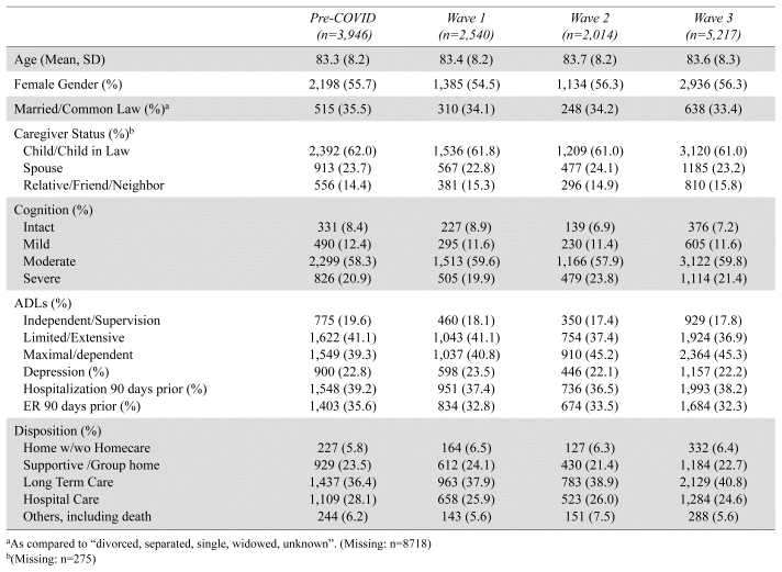 From Apr 01, 2019 to Mar 31, 2022, there were 367,912 hospitalizations among older adults living in Alberta. 3.73% (n=13,717) contained at least one delayed discharge day. The percentage of delayed discharge prior to COVID-19 and during each wave stayed consistent. Wave 3 had the shortest median length of stay (29, IQR 15–51). Wave 2 (45.2%) and Wave 3 (45.3%) had higher proportion of patients requiring maximal assistance on the Activities of Daily Living (ADLs). From pre-COVID to Wave 3, there were increases in the proportions of patients discharged to long term care (36.4% in pre-COVID to 40.8% by Wave 3).