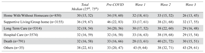 Table 4 reported the median length of delayed discharge stays in hospital by discharge destination and by COVID-19 wave. Pre-COVID, patients discharged to supportive living/group housing had the longest median delayed discharge length of stay (46 days, IQR 22–83), but this fluctuated over the pandemic waves. Among patients discharged to LTC, the pre-COVID median delayed discharge length of stay was 34 days (IQR: 20–56 days); while this dipped during Wave 1 (30 days; IQR: 17–52) and Wave 3 (29 days; IQR: 16–48), it peaked at 38 days (IQR: 22–60) during Wave 2. With the exception of those who were being discharged home, Wave 2 also seemed to have longer length of stay compared to other waves for different disposition locations. Wave 3 also had the shortest length of stay across different discharge destinations compared to the other waves.