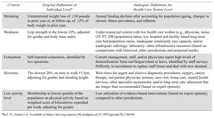 Like people, health care systems (HCS) are complex entities with varying reserve capacity. While the notion of a frail HCS has been raised, its analogy to frailty as understood clinically has not been fully explored. Volpato et al. commented on the lack of functional reserve (specifically shortages in ICU beds and ventilators) in the Italian HCS that led to its inability to “maintain system homeostasis under stressful conditions” during the early days of the COVID-19 pandemic.(5) Doré felt the NHS in England was “crumbling” in the manner of a frail biological system. Initial coping to challenges through utilizing subsidiary pathways over time became over-matched as problems accumulated, persisted and/or worsened.(6)