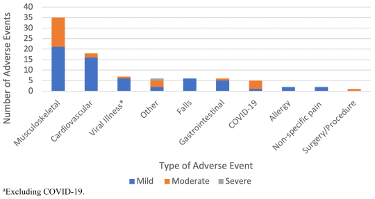 For both unrelated and related AEs, the most commonly reported were musculoskeletal. These included low back, hip, and knee pain. The next most common AEs were cardiovascular (hypertension) and viral illnesses (excluding COVID 19) (Figure 1). For the related AEs, 68.0% (n=17) were classified as musculoskeletal and 24.0% (n=6) were cardiovascular.