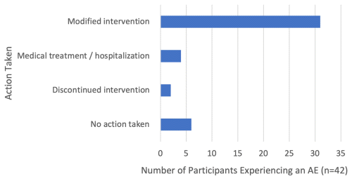 All AEs were recorded, including type, severity, and their relatedness to the intervention. Intervention modifications due to AEs were also recorded.
