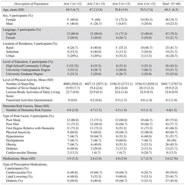 Participants randomized to an intervention arm for SYNERGIC@Home (N=60) had a mean age of 69.5 years (SD=6.47) and were predominantly female (76.7%). Overall, participants tended to be physically inactive, with a mean daily step count of 3,602 (range=301–14,855 steps). Participants were taking an average of 3.6 (SD=2.76) prescription medications, and 48.3% were taking at least one cardiovascular medication. The mean number of dementia risk factors in this sample was 4.6, with the most frequently reported being: poor sleep (75.0%), poor diet (71.7%), first degree relative with dementia (68.3%), and physical inactivity (66.7%) There was no statistically significant difference (p>.05) between any demographic or any other characteristics between the treatment arms (Table 1).