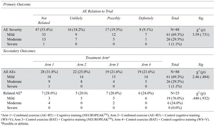 The ICH definition of AEs was used for the SYNERGIC@Home study.(7) AEs were classified by the reviewing study physician for their severity, as well as their relationship to the intervention. The study physician, who was blinded to group allocation, had generic descriptions of participant activities which allowed them to ascertain relatedness to the intervention. All intervention arms included a component of exercise. For severity, mild was used when there was no disruption of normal daily activity, moderate when there was an effect to normal daily activity, and severe when the AE caused the inability to work or perform normal activity. The relationship was labelled as: not related, unlikely, possible, probable, or definite. Standard descriptions for AE relationship were used for each category and provided to the staff reviewing the AE. Only AEs reported during the 16-week physical and cognitive intervention stage were used for this analysis.