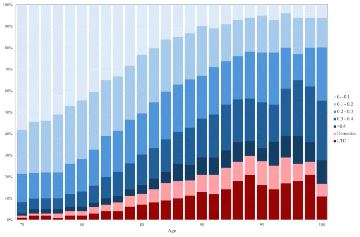 Frailty, dementia, and LTC use all increased with age (Figure 1). At the age of 75, fewer than 10% of the study members were living with frailty (more than 0.4 on the FI), dementia, or in LTC. However, this proportion increased steadily from age 75 to 95, at which age more than one-third were living with frailty, dementia, or in LTC. Note that these numbers represent the point prevalence at a specific age and not the trajectory of frailty for an individual. When we considered different aspects of frailty, we found a similar association with age—medical conditions, functional impairment, and psychosocial deficits all increased with age (see Figure S2 in the Supplementary Material). At all ages, the medical component had the lowest score, while the functional component had the highest.