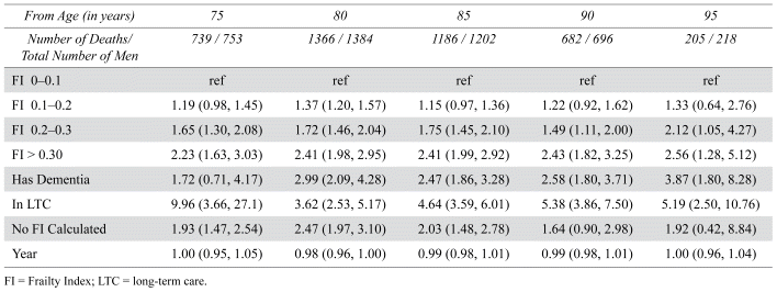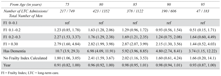 When we considered the mortality risk associated with the FI, we found a very strong and consistent graded association: those with a higher FI had a markedly higher risk of mortality. Those living in LTC consistently had the highest mortality risk, and those living with dementia also had a high mortality risk. The Kaplan Meier plots at various ages are shown in Figures S2 to S6 in the Supplementary Material. They show the time to event for death by frailty category at different ages. The mortality risk with frailty was seen across all ages, even at very advanced ages. Similarly, there was an association between frailty and the time to LTC, even at advanced ages. This association was noted as a gradient across frailty categories. Note as well that both living with dementia and living in LTC were strongly associated with death. Table 1 shows the results of the Cox proportional hazards models for mortality at various ages. At all ages, the FI index predicted survival time, even after considering period effects. This association with mortality appeared to be a gradient effect across the FI, as has been previously postulated.(15) The FI was also strongly associated with LTC utilization across all ages. Similar to previous reports, persons living with dementia were also at a high risk of LTC admission.(16) The supplementary figures show the Kaplan Meier plots for LTC admission. The Cox proportional hazards models for LTC admission are shown in Table 2, which also show a strong and graded effect of frailty on the risk of LTC utilization.