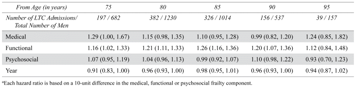 When we consider the domains of our FI, we found that different aspects of frailty were associated with mortality differently (Table 3). Functional impairment was a strong predictor of death at all ages throughout the study. However, the effect of medical conditions declined with advancing age. Psychosocial factors were generally less strongly associated with death than the other domains. Similarly, functional impairment predicted LTC admission at nearly all ages, except very old age; whereas the effect of medical conditions was increasing less apparent with advancing age (Table 4).