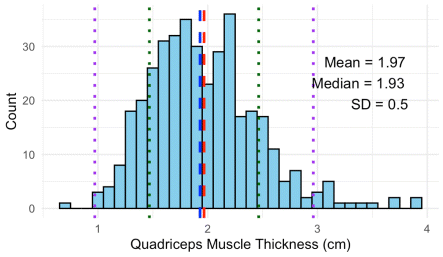 Of 391 participants, 389 were included in the final analysis due to missing age data. Age, sex, and quadriceps muscle thickness were extracted from the original datasets and merged into a single dataset. The normality of the age distribution was assessed using the Shapiro-Wilk test and visual inspection of histograms. Age was categorized into five-year groups (65–69, 70–74, 75–79, 80–85, and over 85 years). Means and standard deviations (SD) of quadriceps thickness were calculated by sex and age group, and the group differences were tested using Student’s t-test. The overall distribution of quadriceps thickness was visualized, with mean, median, and SD reported. Statistical analyses were conducted using R software (Version 2025.05.1–513; R Foundation for Statistical Computing, Vienna, Austria).(6)