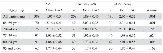 Data from 389 participants (180 males and 209 females) were included in the analysis. Mean age was 77 ± seven years. Quadriceps muscle thickness followed a normal distribution with a standard deviation of 0.5 cm (Figure 1). Mean thickness declined progressively with advancing age (Table 1). The mean quadriceps muscle thickness among older adults aged 65 years and older was ~2.0 cm. Significant sex differences were observed in the 65–69 and 80–84 year age groups.
